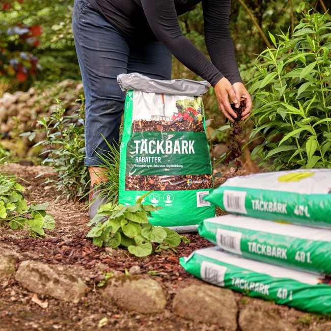 Ett lager på 5–10 cm täckbark skyddar effektivt mot ogräs, bevarar fukten i jorden och minskar bevattningsbehovet. Under vintern fungerar barken som skydd mot tjäle – kupa gärna upp barken högt kring växternas rothals för bästa effekt.